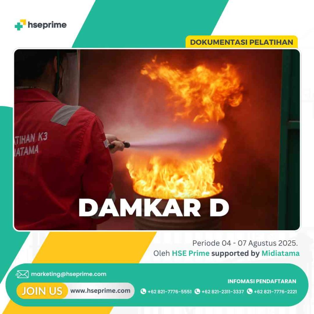 Pelatihan Kebakaran Kelas D bertujuan untuk memberikan pengetahuan dasar pencegahan, penanggulangan kebakaran dan juga mempersiapkan petugas dan tenaga kerja untuk menanggulangi kebakaran dalam perusahaan/organisasi. Pelatihan Damkar kelas D penting karena kebakaran kelas D merujuk pada kebakaran yang melibatkan logam-logam khusus atau logam paduan yang dapat menyala atau terbakar dengan mudah jika terkena panas atau api. Contohnya magnesium, titanium, aluminium, natrium, dan potassium.