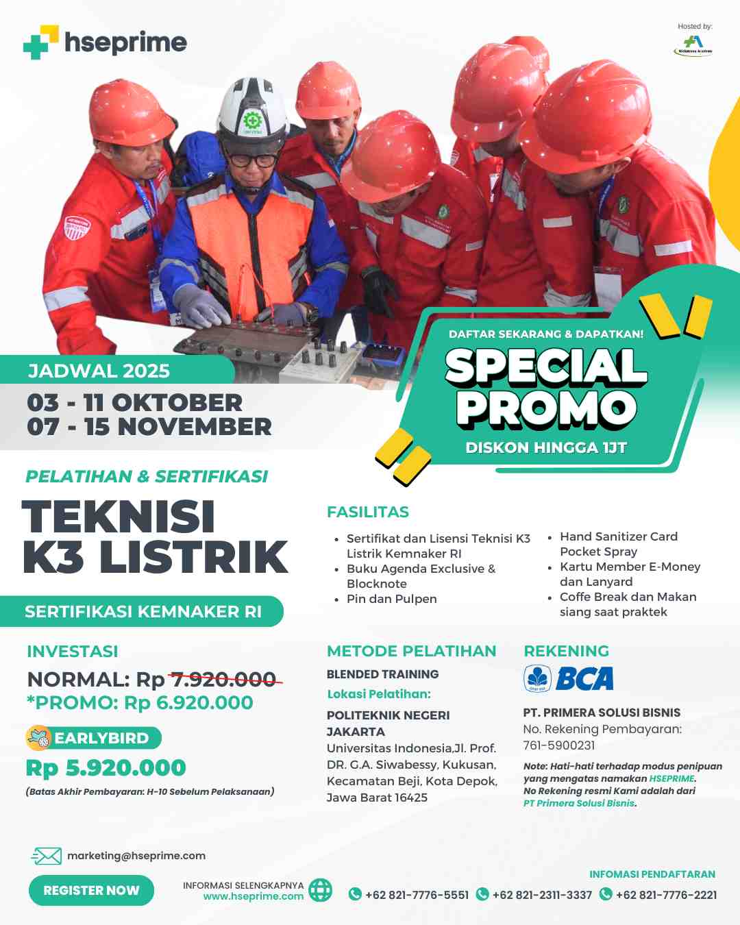 Dapatkan DISKON Pelatihan Teknisi K3 Listrik Sebesar IDR 1jt & PROMO EARLY BIRD