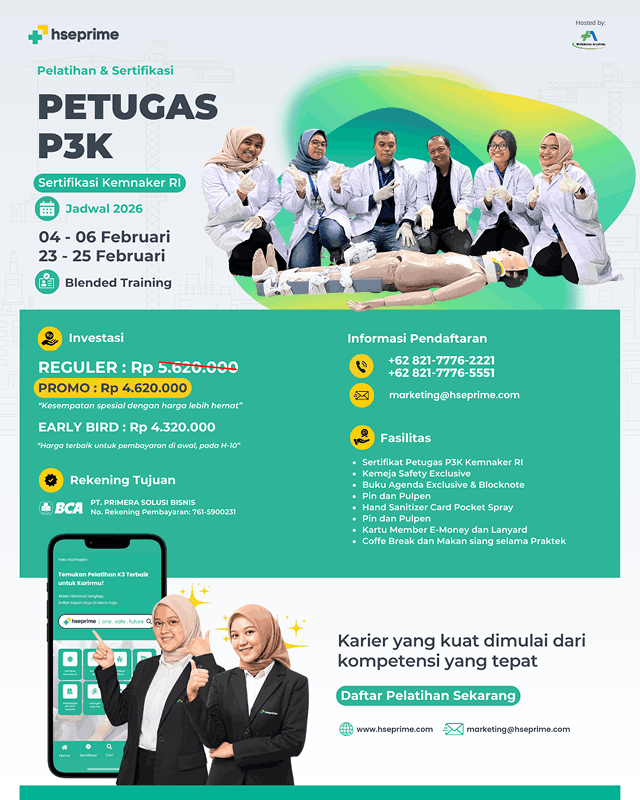 Training First Aid atau Pelatihan Petugas P3K adalah program KEMNAKER RI untuk mempersiapkan Ahli K3 di perusahaan yang dapat membantu mengembangkan K3 di perusahaan. P3K atau Pertolongan Pertama Pada Kecelakaan di tempat kerja, berdasarkan Permenaker No:PER.15/MEN/VIII/2008 yang selanjutnya disebut dengan P3K di tempat kerja, adalah upaya memberikan pertolongan pertama secara cepat dan tepat kepada pekerja, buruh dan atau orang lain yang berada di tempat kerja, yang mengalami sakit atau cidera. Maka dari itu Untuk penerapan K3 di perusahaan atau dilingkungan kerja perlu adanya Training First Aid agar tidak terjadi kecelakaan yang merugikan semua pihak dan sebagai bentuk apresiasi terhadap pelaksanan zero accident.